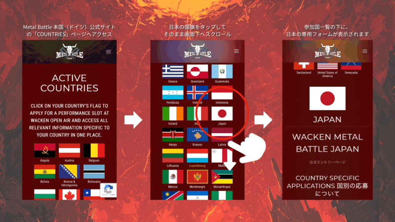 エントリーはMetal Battle 本国(ドイツ)公式サイトの所定のフォームより行い、バンド情報および音源・映像資料の提出が必要となります。